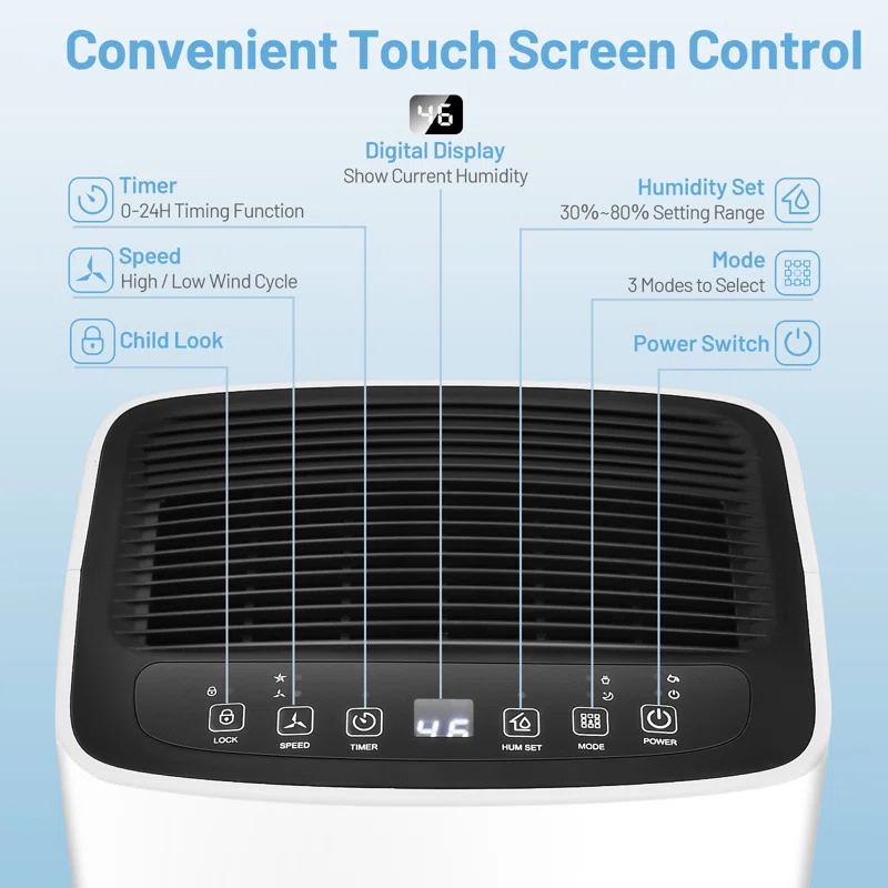 Our dehumidifier will bring you a comfortable and healthy living environment! The dehumidifier can quickly and quietly remove up to 24 pints (86°F, 80%RH) of moisture from the air per day, fitting for medium rooms in areas up to 1,500 sq. ft. it is designed with an adjustable humidity range between 30-80% and an intelligent touch control panel for you to adjust ideal indoor humidity easily. Meanwhile, a reusable and washable filter preserves fresh and clean air quality. The modes and speeds can be changed easily depending on your needs. The 12-hour timing function is suitable for preset operations and can reduce energy consumption. In addition, when the water tank is full, the indicator will turn red and the unit will buzz 5 times to remind you to pour away water. 4 Universal wheels allow you to move or carry the dehumidifier to any place you want, like home, basement, and office.
